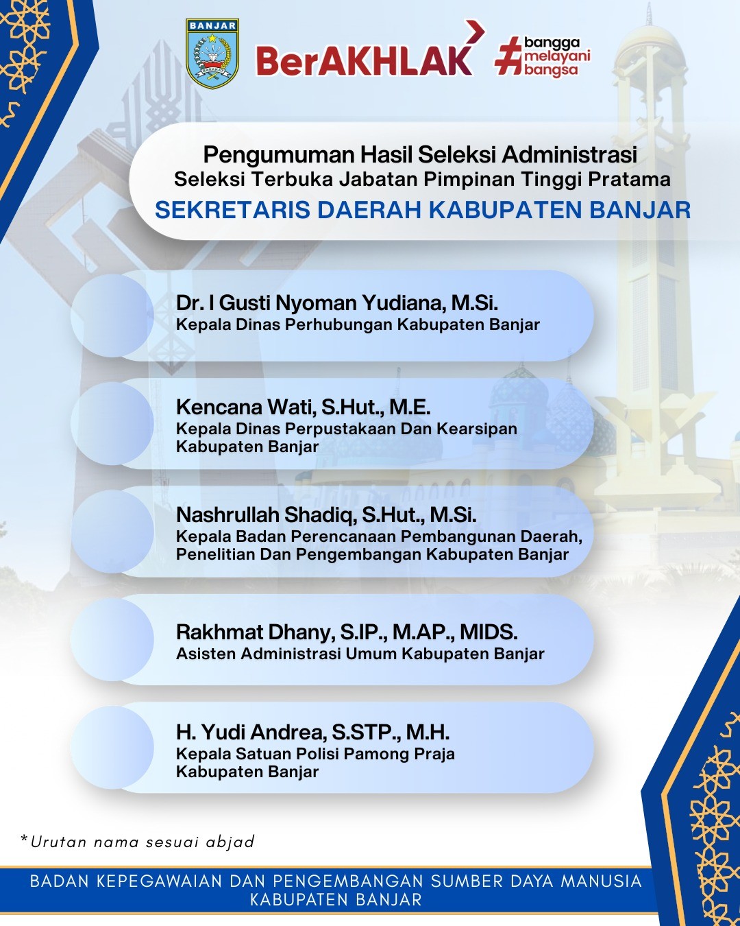 Berikut disampaikan pengumuman hasil seleksi administrasi seleksi terbuka jabatan pimpinan tinggi pratama untuk jabatan sekretaris daerah kabupaten banjar